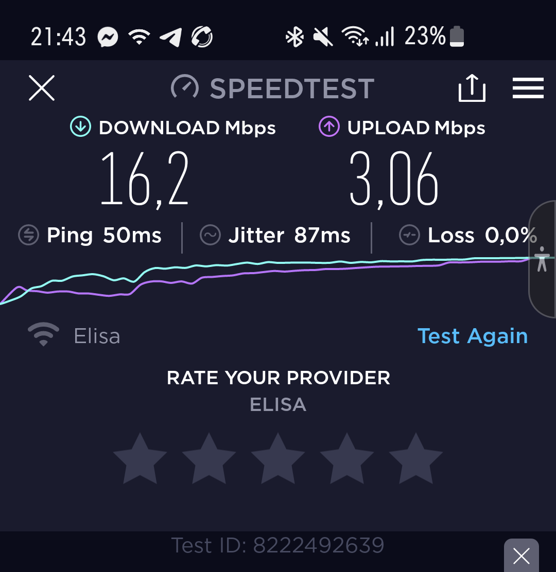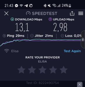 - Maksimum kiirused: alla 21.6 Mbps , üles 5.76 Mbps (Lisatud näidis kiirustesti tulemused Elisa võrgus)